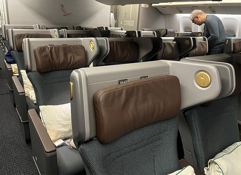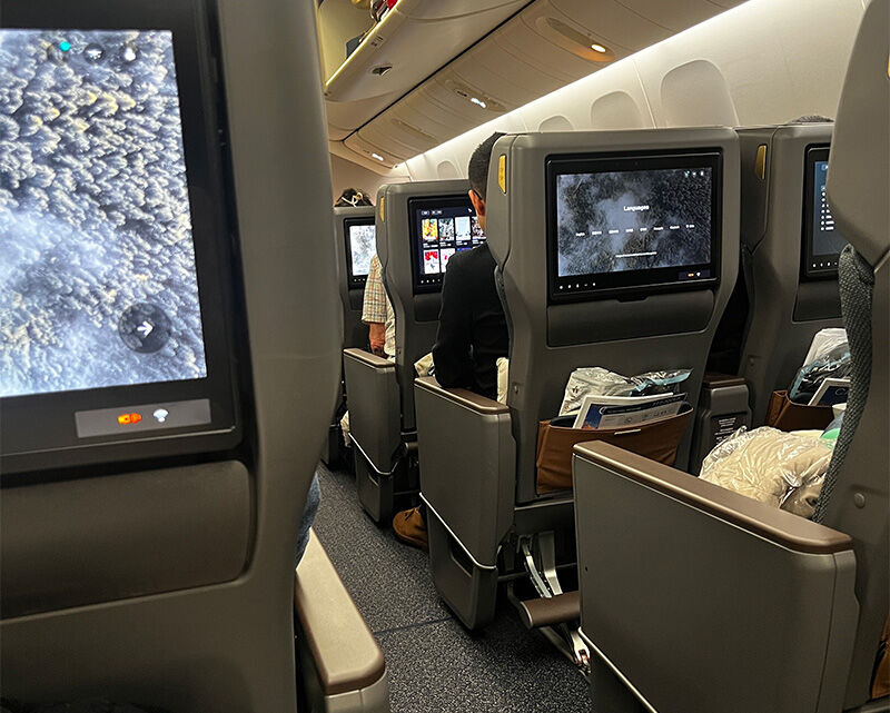 残念ながらアリアスイートへのアップグレードはかなわなかったのですが、新デザインのプレミアムエコノミーに座ることができました。